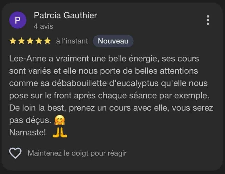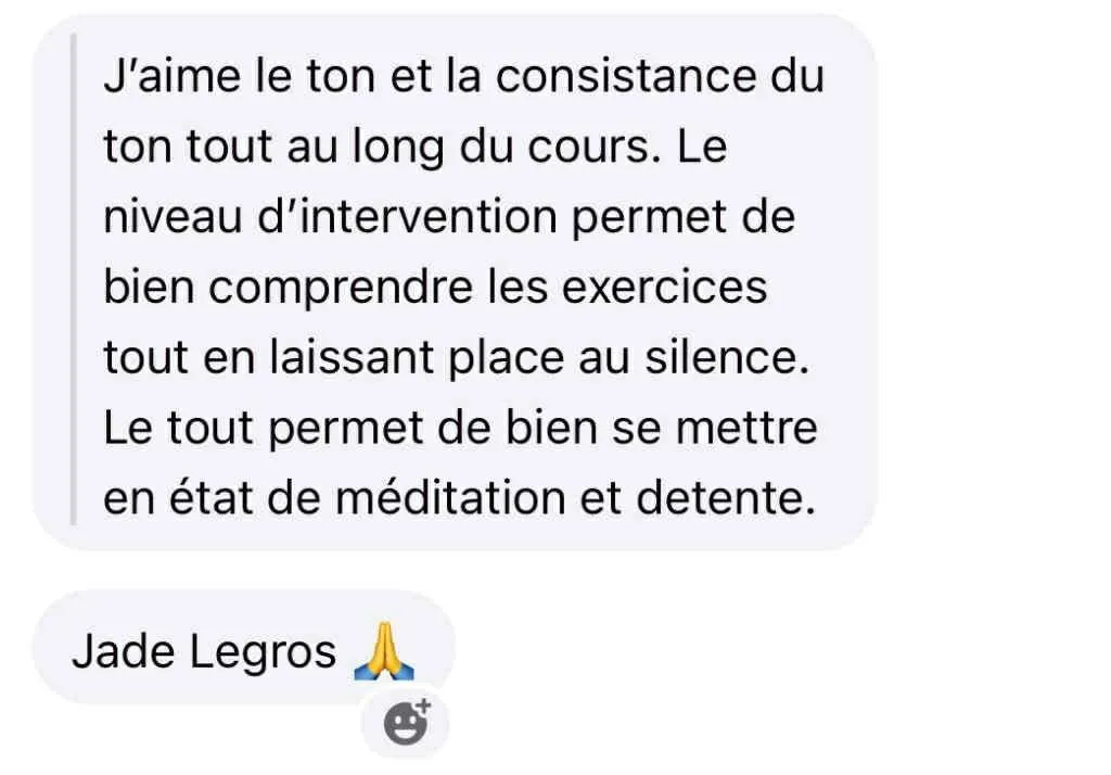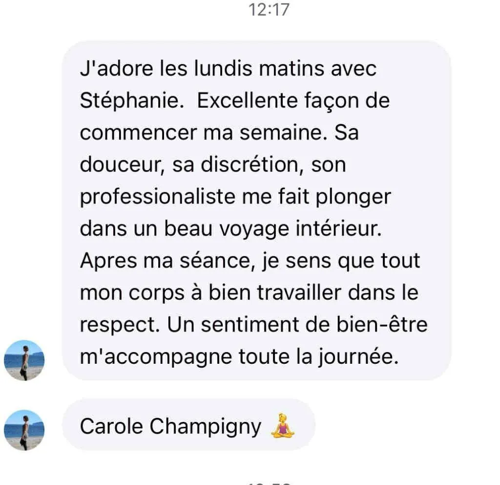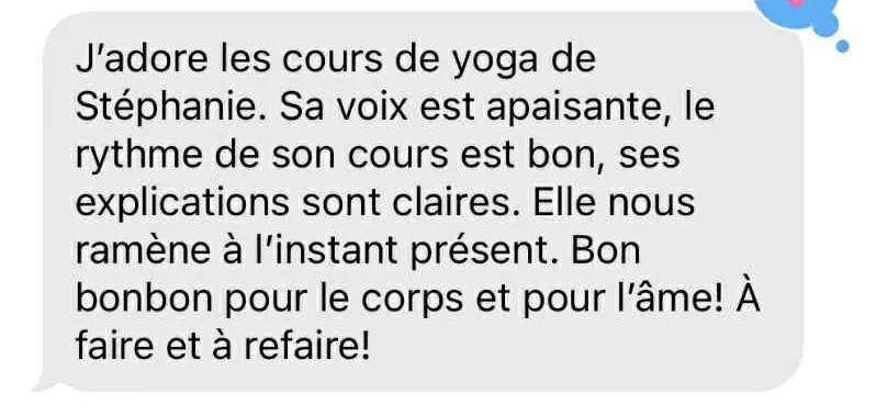 J’adore les cours de yoga de Stéphanie. Sa voix est apaisante, le rythme de son cours est bon, ses explications sont claires. Elle nous ramène à l’instant présent. Bon bonbon pour le corps et pour l’âme! À faire et à refaire!